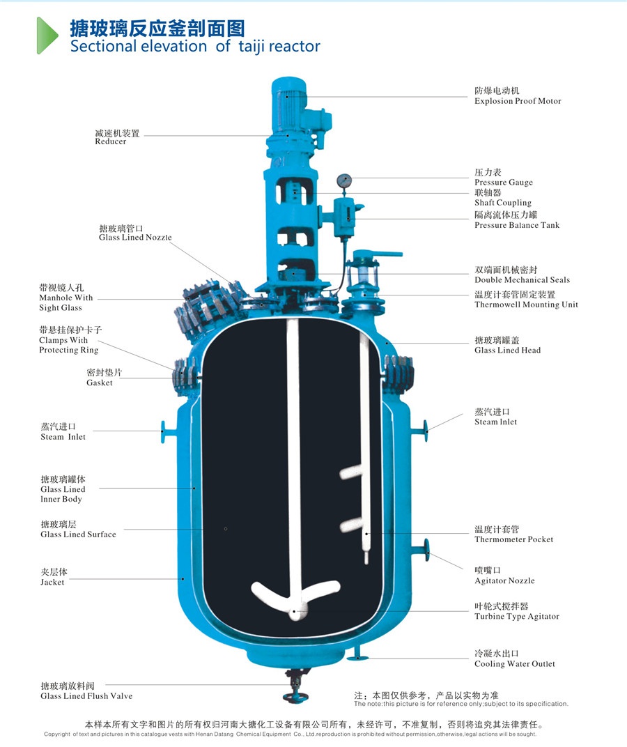 3、搪玻璃電加熱反應(yīng)釜是由搪玻璃罐體、搪玻璃罐蓋、搪玻璃攪拌器、夾套、加熱管、支撐和傳動裝置、密封裝置等組成,物料和噴嘴可根據(jù)用戶的工藝要求確定。我們還根據(jù)客戶的需要設(shè)計和經(jīng)銷非標(biāo)準(zhǔn)搪玻璃電加熱反應(yīng)釜。